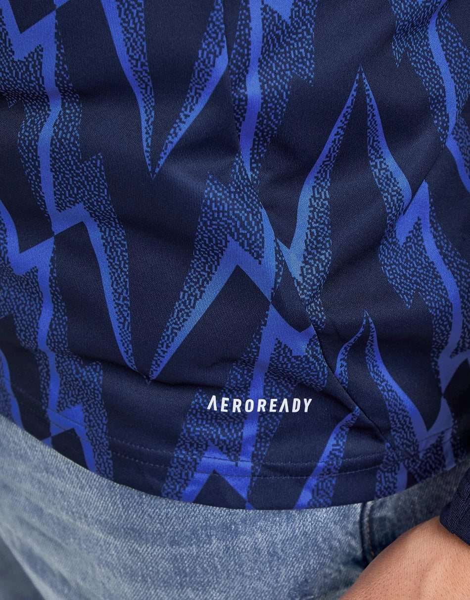 The adidas Arsenal FC 2025/26 Long Sleeve Away Shirt is a bold modern take on a classic ’90s design. It features a dark navy base with a striking light blue lightning graphic, symbolizing the club’s energy and determination. Made from recycled polyester with AEROREADY technology, it ensures moisture management and comfort. Classic red three-stripe detailing on the shoulders and an embroidered cannon on the chest honor Arsenal’s rich heritage, blending history with contemporary style.